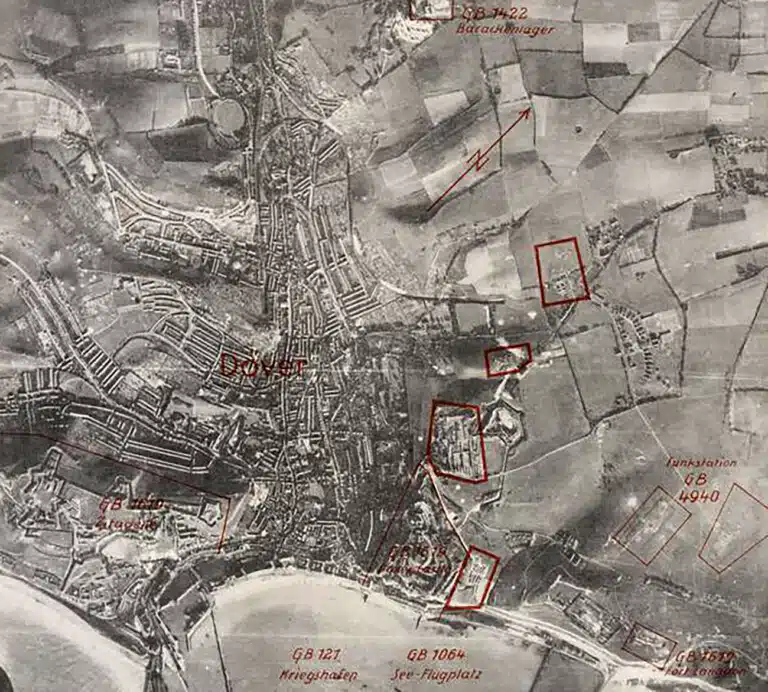 The bombing and shelling of Dover resulted in 3,059 air-raid alerts, 216 civilians killed and 10,056 properties damaged. A network of caves and tunnels were located within the cliffs and were regularly used as air-raid shelters and as a military base. Dozens of anti-aircraft guns were installed along the coast, along with some massive naval guns with the ability to reach. Some of the military targets identified by the Luftwaffe in the area are shown in the 1940 reconnaissance photograph below.
